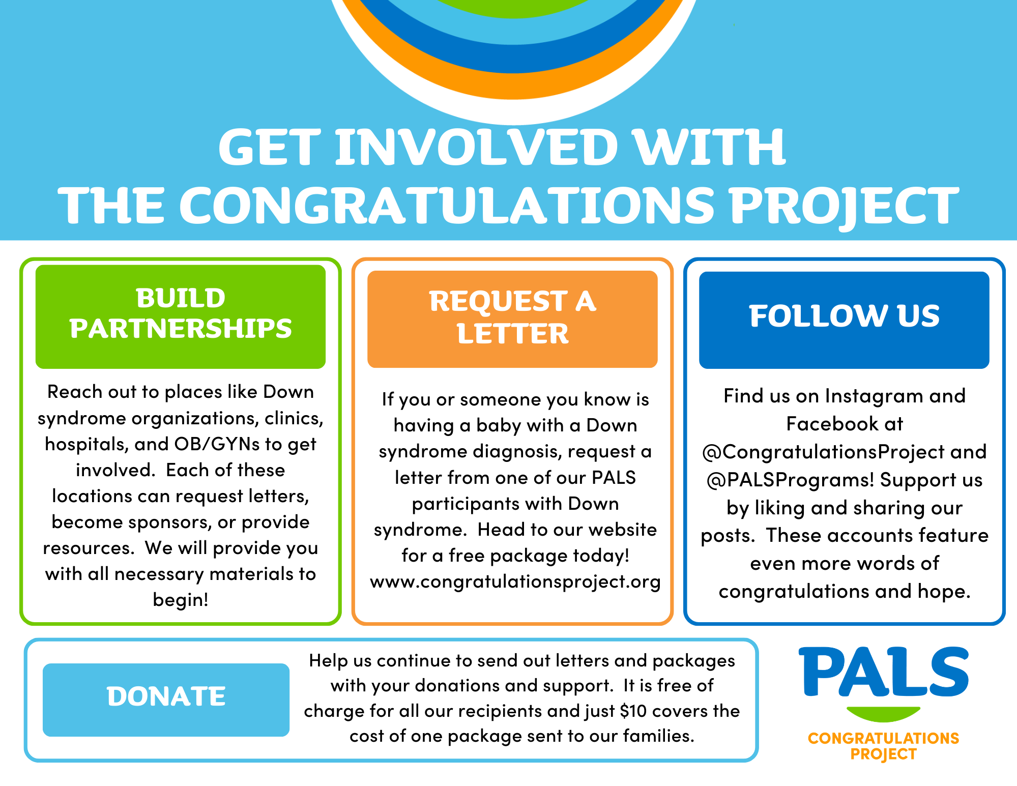 Become a Congratulations Project Distribution Partner: Our Distribution partners receive Congratulations Project letters to give new families after receiving the Down syndrome diagnosis. We are grateful for each partner sharing the words of individuals at PALS to bring joy, hope, and welcome. If you are interested in creating a partnership, email congratulations@palsprograms.org.